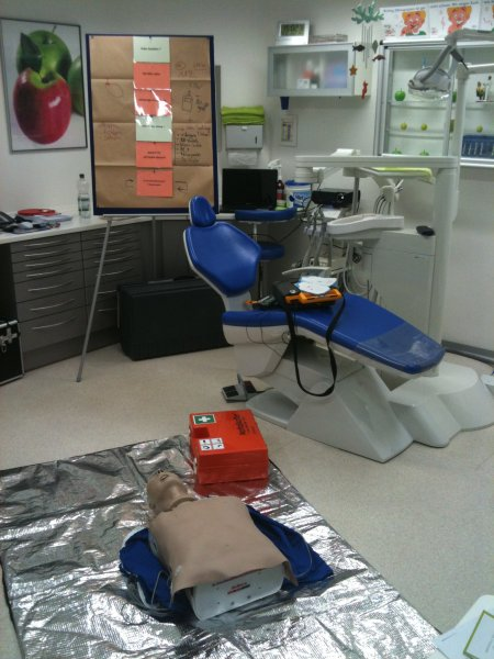 Das Notfalltraining findet in Ihrer Praxis statt. So kann auf Ihre individuellen Gegebenheiten optimal eingegeangen werden. Wissen Sie zum Beispiel, ob auf Ihrem Zahnarztstuhl die Reanimation möglich ist ? Zudem haben wir so die Möglichkeit, gemeinsam mit Ihnen Ihre Ausrüstung checken. Der Kurs dauert ca. 3 Stunden ohne Pausen. Die Kurse finden tagsüber abends oder an Wochenenden statt. Ganz nach Ihren Wünschen.